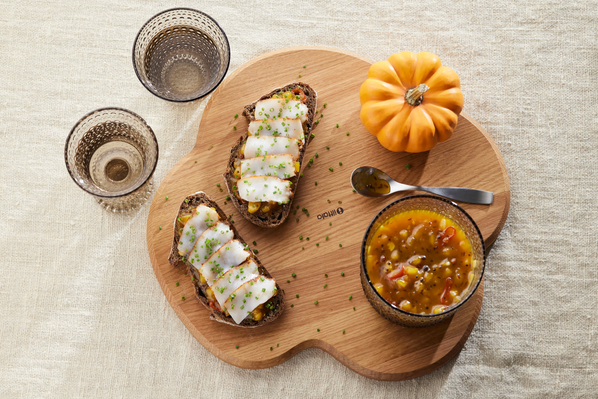 - Gediminas rekomenduoja moliųgų čatnį užtepti ant juodos duonos ir ant viršaus uždėti labai plonai pjaustytų lašinių. Pagardinkite smulkiai pjaustytu laiškiniu česnaku ar svogūno laiškais.