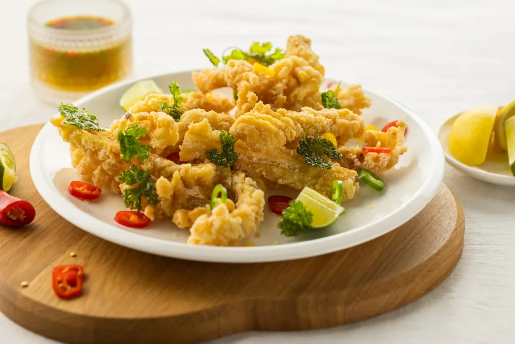 Traškūs kalmarai su saldžiarūgščiu mangų padažu