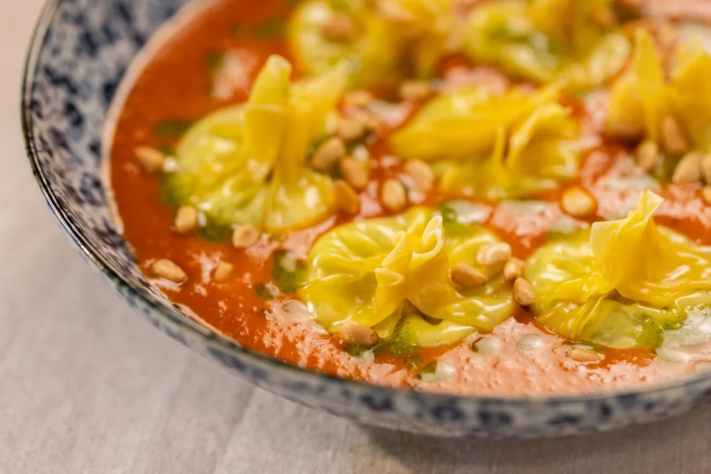 Pomidorinė sriuba su koldūnais įdarytais sūriu
